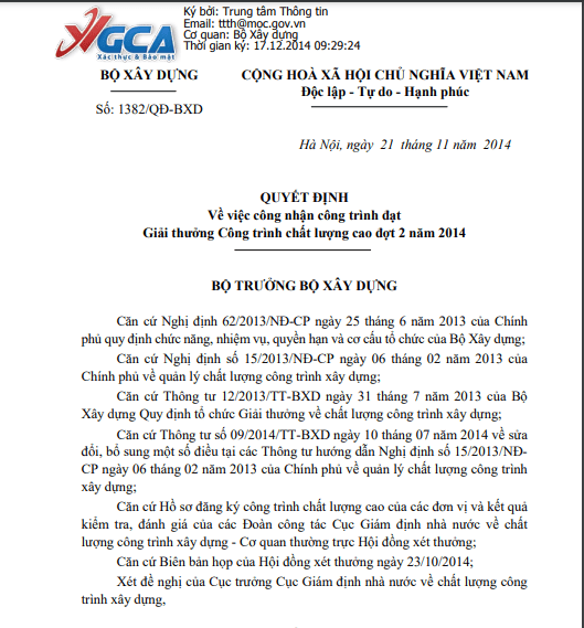 Công trình vinh dự đón nhận giải thưởng công trình chất lượng cao năm 2014 của Bộ Xây Dựng